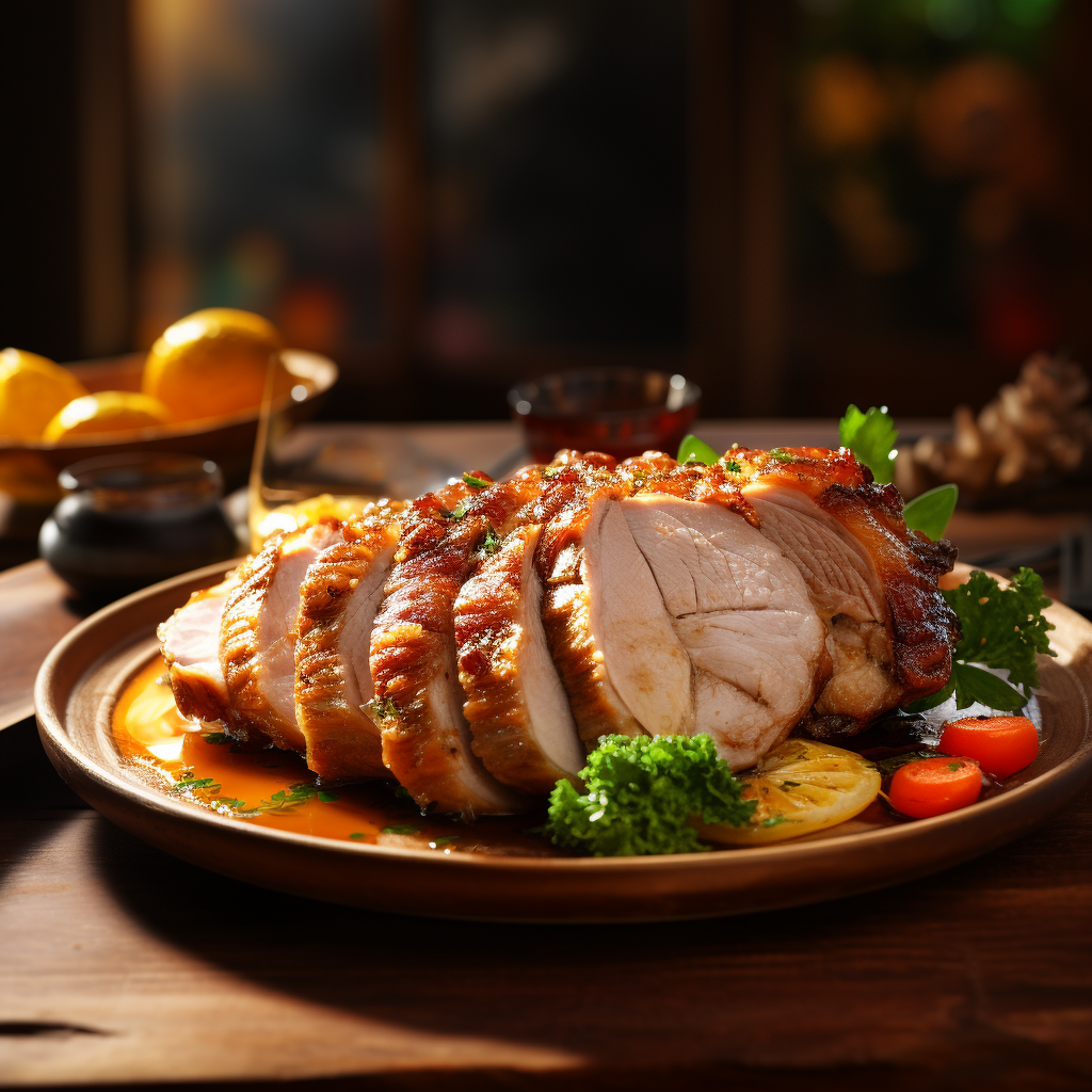 Turducken - Eine goldbraun gebratene Truthahnente liegt auf einem Tablett, garniert mit frischen Kräutern und Herbstblättern. Im Hintergrund leuchtet warmes Kerzenlicht, das mit kleinen Kürbissen und rustikaler Holztischdekoration eine gemütliche, festliche Atmosphäre schafft. Diese Beschreibung wurde mit der FootballR KI automatisch generiert.
