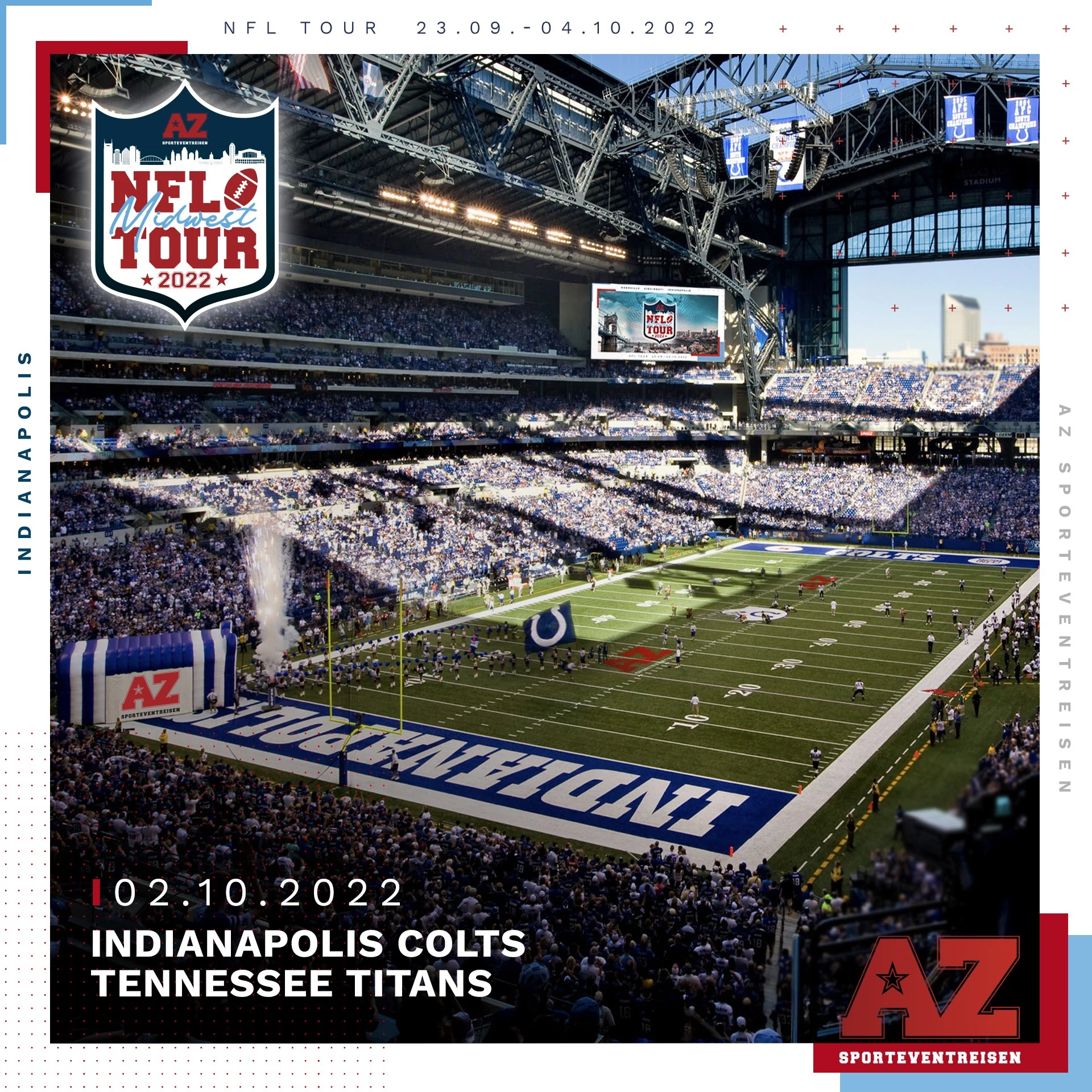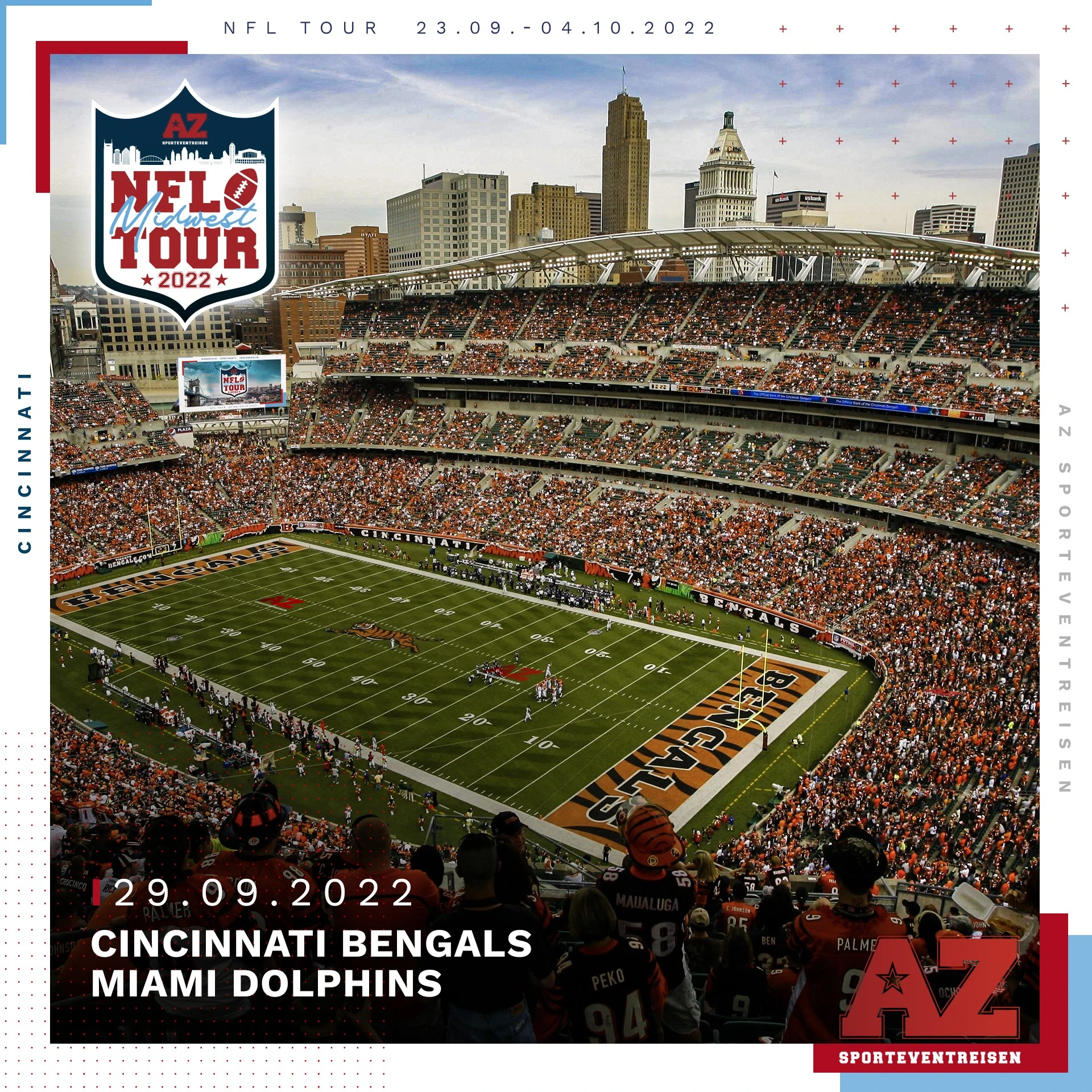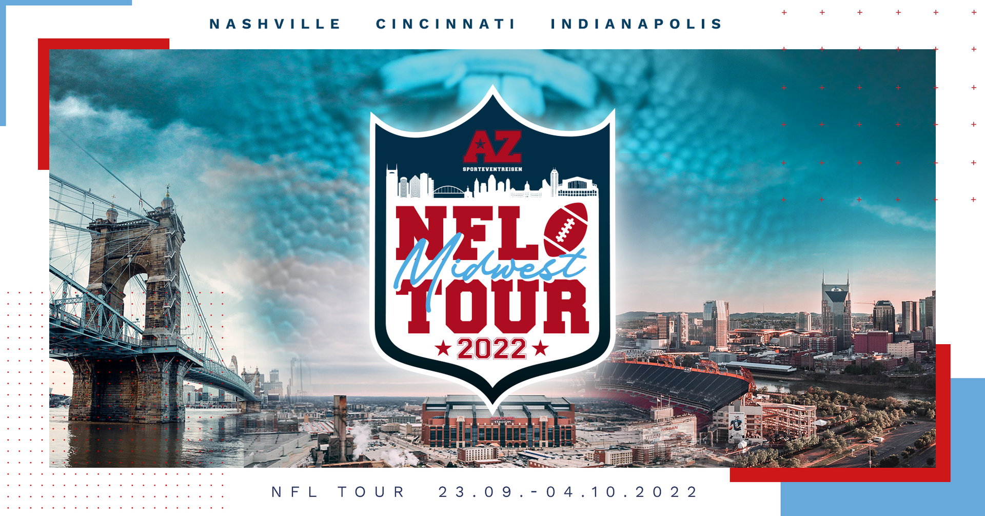 Die womöglich beste Reise des Jahres wartet auf dich. In 11 Tagen besuchst du als Teilnehmer ganze drei NFL Spiele (Titans-Raiders, Bengals-Dolphins, Colts-Titans), zusätzlich gibt es eine private Stadiontour im Nissan Stadium und sogar ein College Football Spiel ist im Preis enthalten.