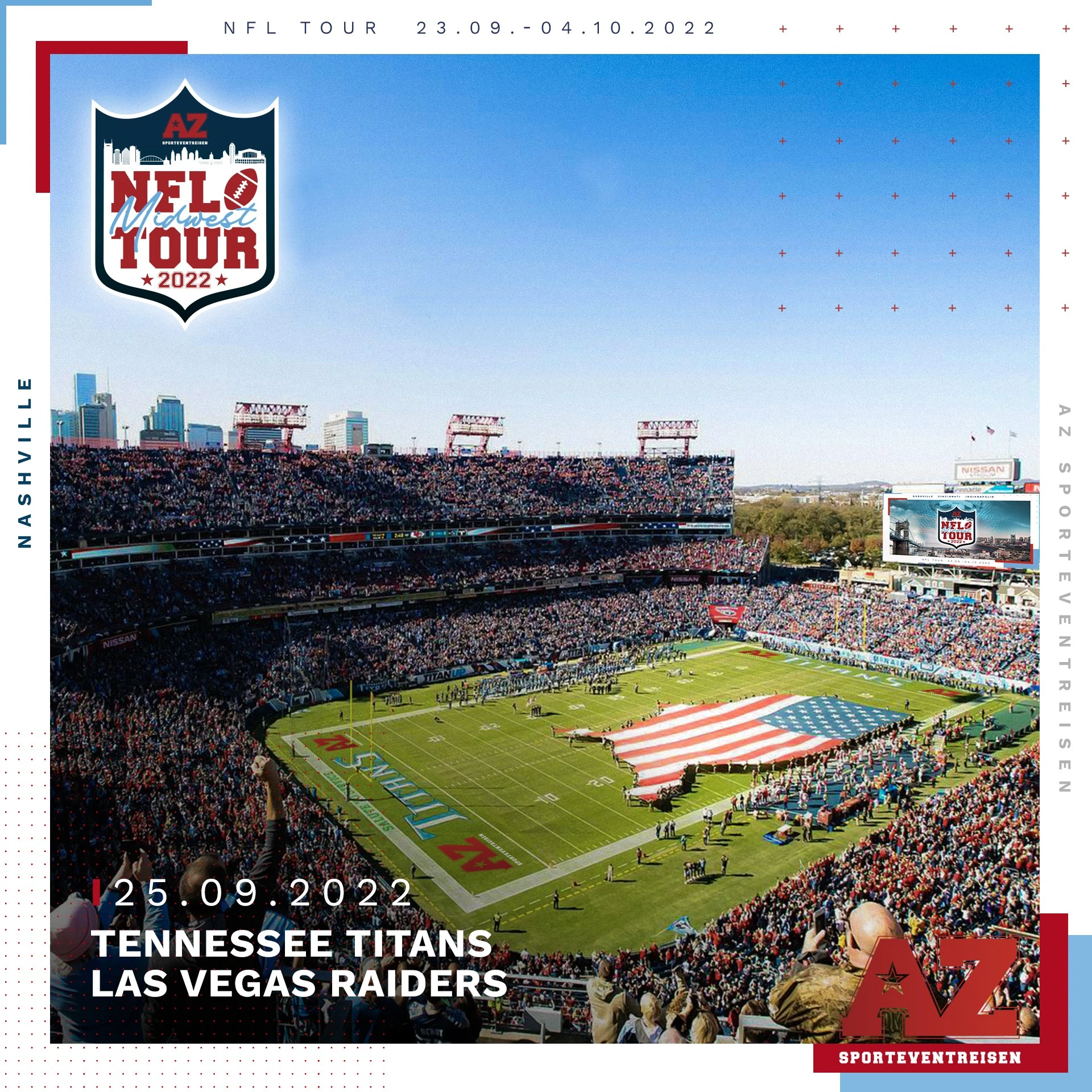 Los geht’s am 23.09.2022 in Frankfurt. Von dort geht es nonstop nach Atlanta. Danach geht es direkt nach Nashville, der Hauptstadt der Country Music und Heimat der Tennessee Titans. Diese erlebst du folgerichtig auch im ersten Spiel gegen die Las Vegas Raiders, mit dem Deutschen Jakob Johnson. Nashville bietet als Partystadt genau den richtigen Einstand in die Tour und bevor es weitergeht gibt es noch eine private Stadiontour im Nissan Stadium.