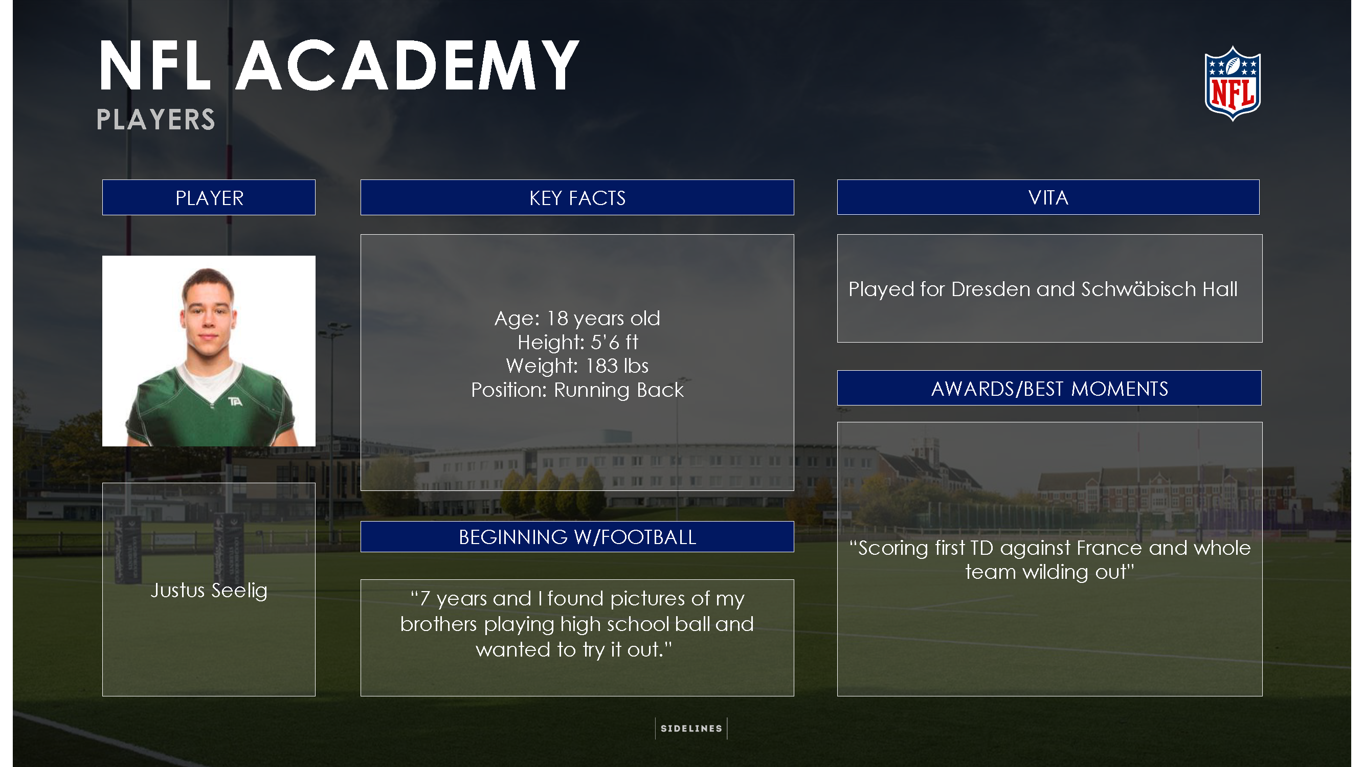 Alexander Steinforth, General Manager NFL Deutschland: „Die NFL Academy in Loughborough eröffnet talentierten Nachwuchsspielern aus verschiedenen Ländern einen Weg in den amerikanischen College Football und schafft eine weitere Möglichkeit für junge Football-Talente sich für eine Profikarriere zu qualifizieren. Aus deutscher Sicht sind wir sehr stolz darauf, dass wir derzeit acht junge Nachwuchstalente in Loughborough ausbilden.“