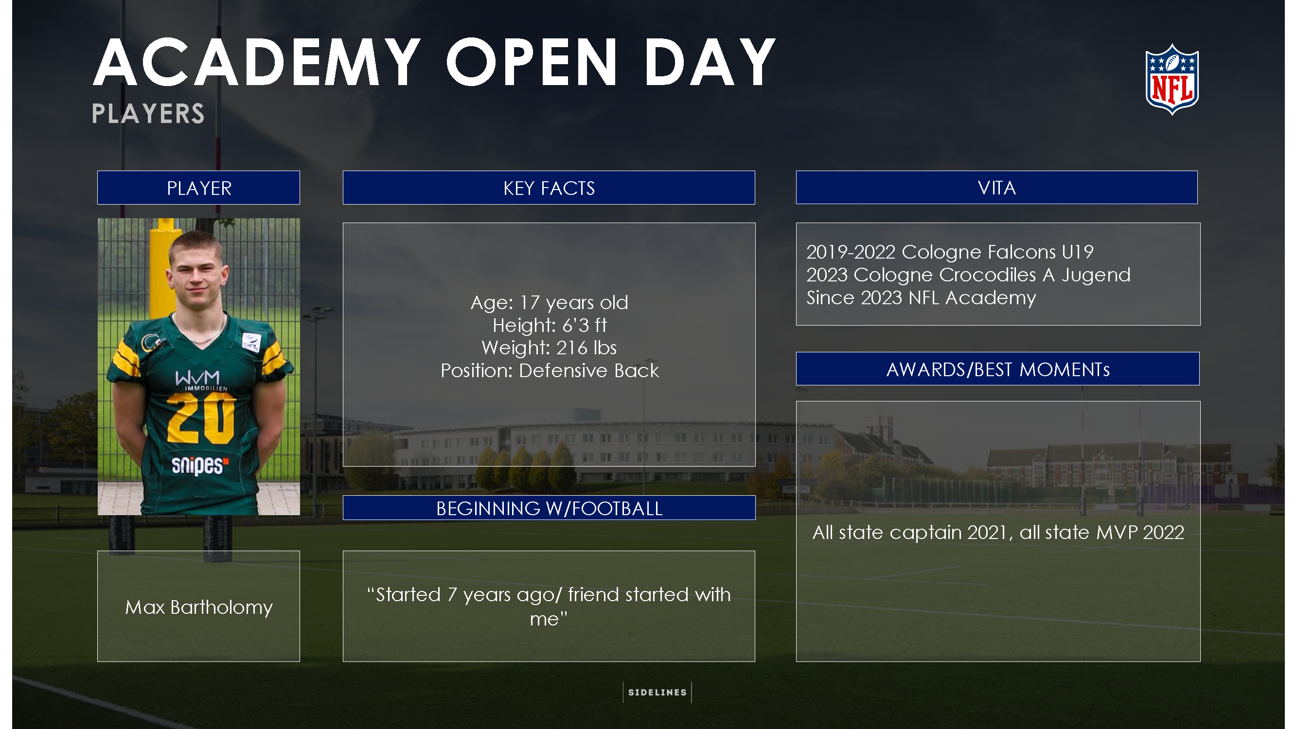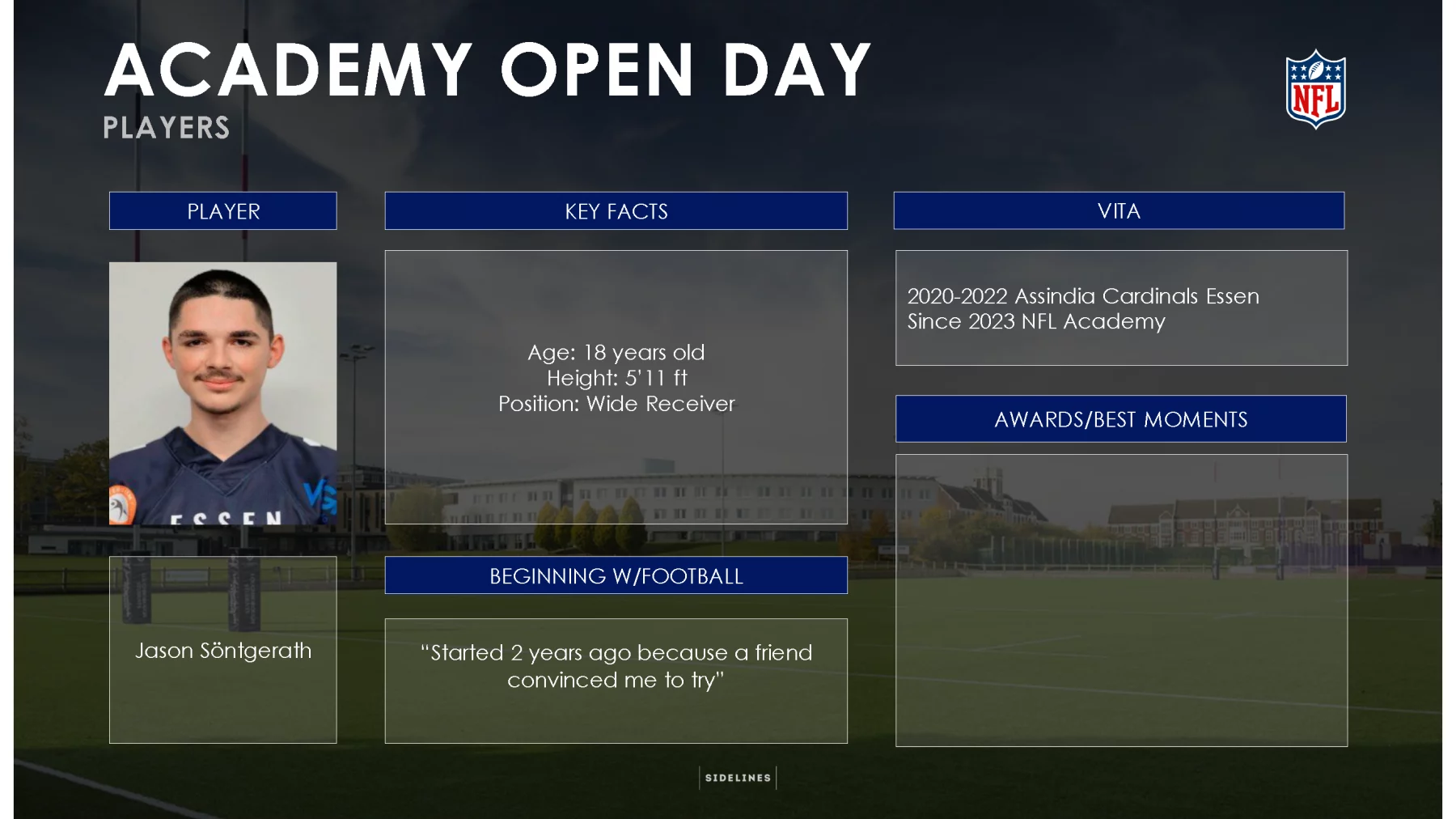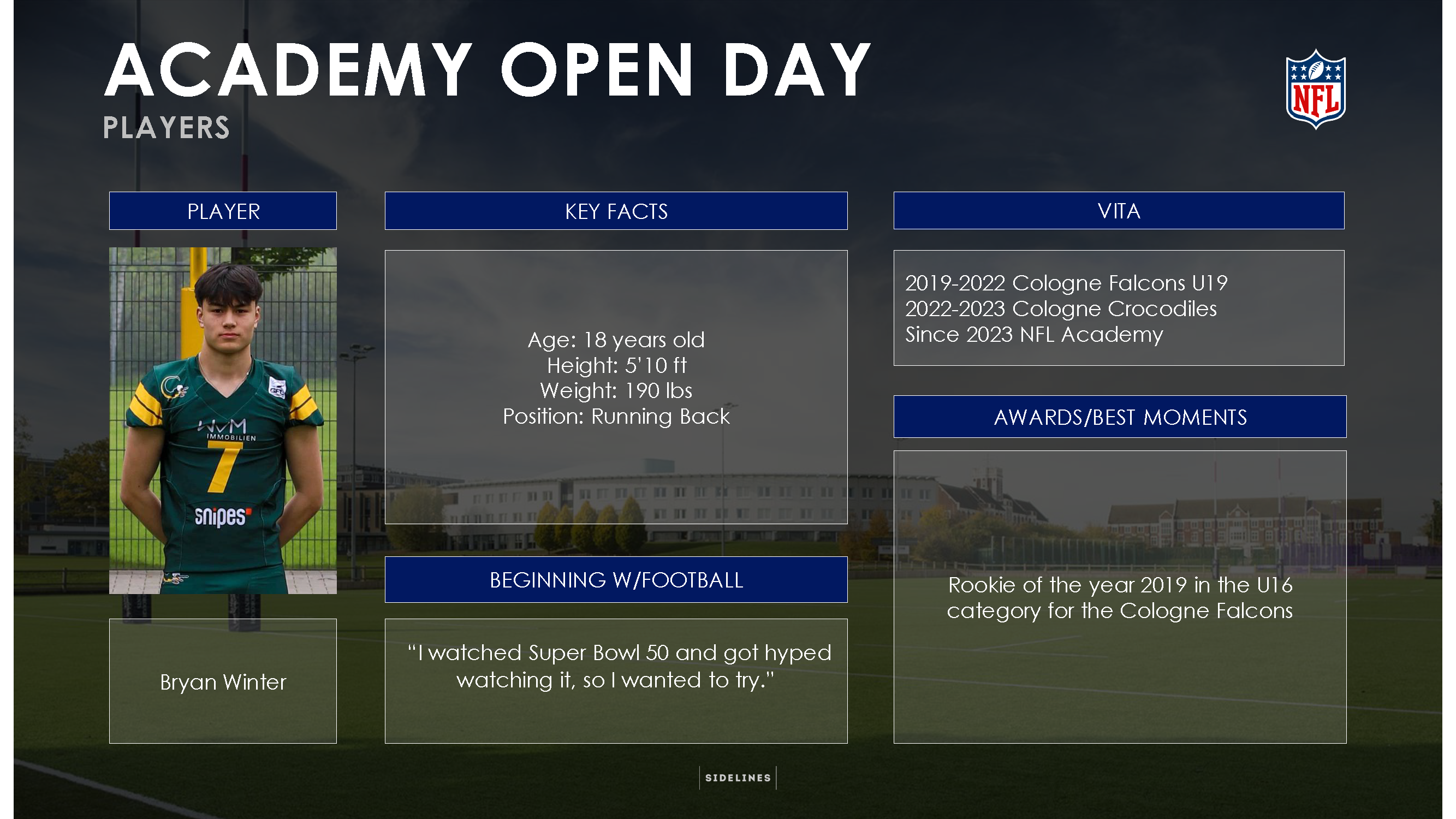 Unter den Schülern, die es den 15 Vorgängern gleichtun wollen, befinden sich mit Paul Breuer (Ausbildungsverein: Troisdorf Jets), Bryan Winter, Max Bartholomy (beide Cologne Falcons & Crocodiles), Benjamin Kienz (Schwäbisch Hall Unicorns), Liam Kling (Paderborn Dolphins), Jason Söntgerath (Assindia Cardinals Essen), Joel Queißer (Düsseldorf Panthers) und Justus Seelig (Dresden Monarchs / Schwäbisch Hall Unicorns) gleich acht deutsche Athleten, die vom Weg in die NFL träumen. Dem Traum vom NFL-Profi-Dasein schon etwas näher gekommen ist Dominic Braesch – der Offensive Lineman hat sich nach seiner Zeit bei der NFL Academy für die die Georgia State University (USA) committet, um seine Karriere in der NCAA fortzusetzen.