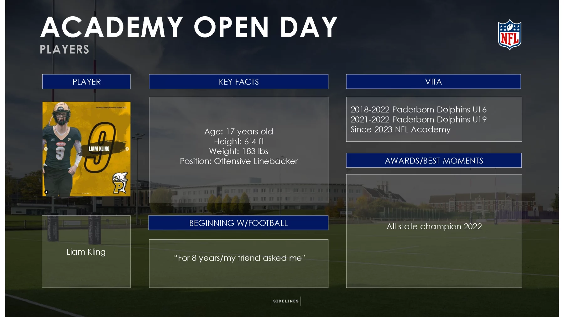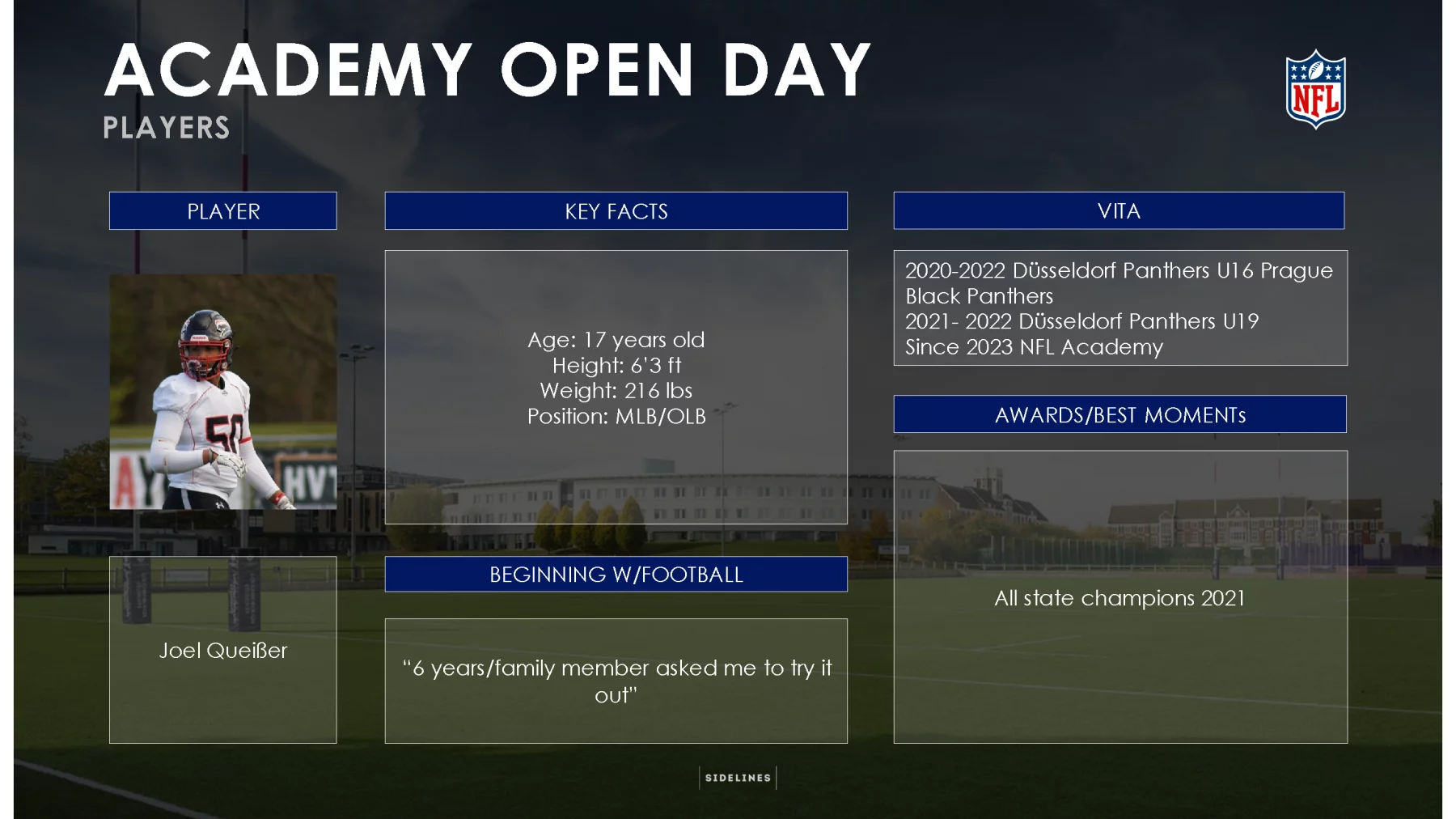 Beim NFL Academy Open Day an der Loughborough University – eine der renommiertesten Sportuniversitäten weltweit – konnten sich Interessierte und Medien einen Einblick in dieses einzigartige NFL Talentsichtungs- und Förderprogramm mit holistischem edukativen Ansatz verschaffen. Seit 2019 haben junge Football Talente an der NFL Academy in Loughborough die Möglichkeit, an diesem speziellen Programm auf High-School-Niveau teilzunehmen und sich für den nächsten Schritt des College Footballs und der anschließend angestrebten NFL Karriere zu empfehlen. 15 Absolventen der NFL Academy werden in der 2023-24 Saison NCAA Football spielen.