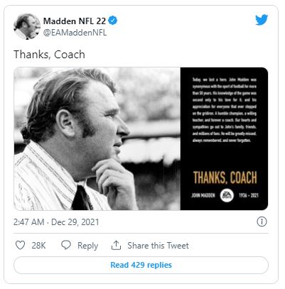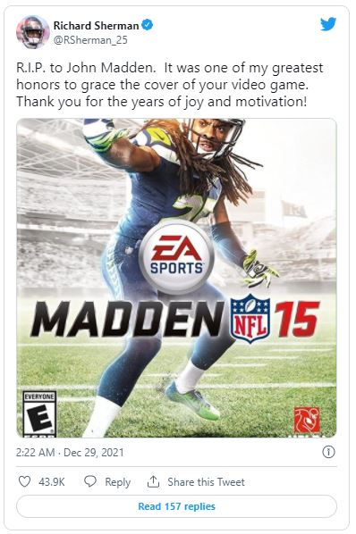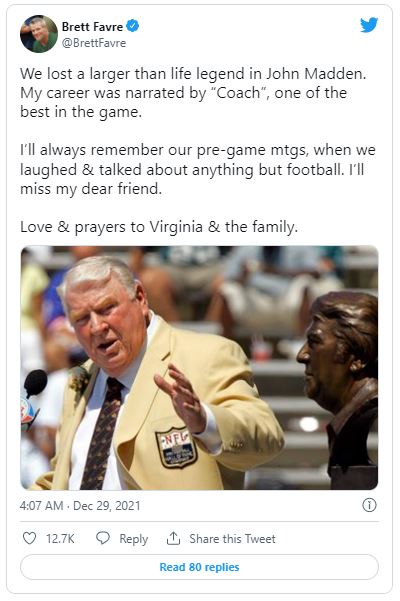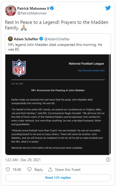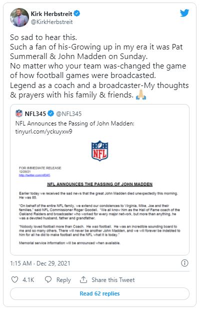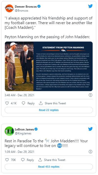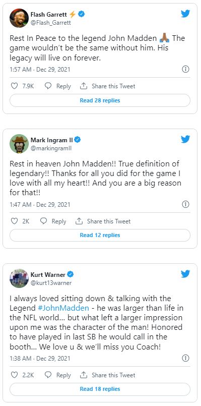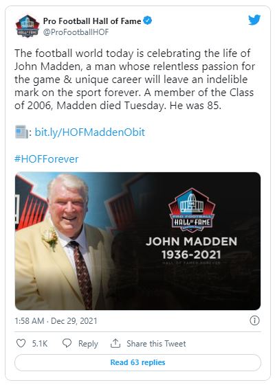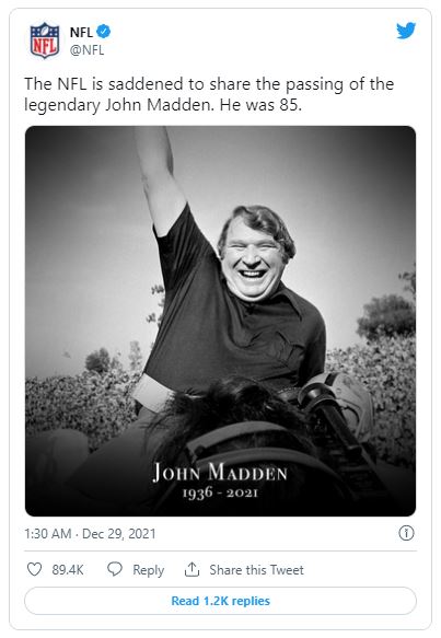 Nachdem bekannt wurde, dass der Football-Pionier John Madden am Dienstag im Alter von 85 Jahren verstorben ist, würdigte die Sportwelt den ehemaligen NFL-Coach, Broadcaster und Videospiel-Namensgeber mit zahlreichen Postings.
