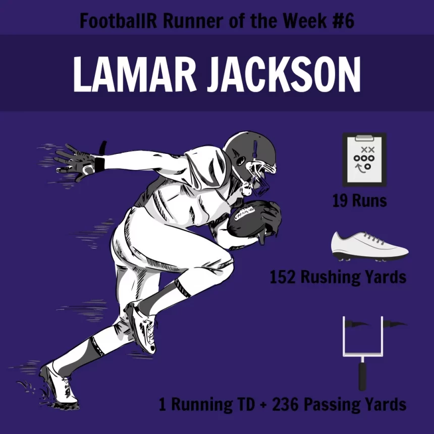 In dieser Woche geht die Auszeichnung für den besten Runner nicht an einen Running Back, sondern an Lamar Jackson, den Quarterback der Baltimore Ravens. Mit 152 Rushing Yards bei 19 Versuchen (Durchschnitt: 8 Yards per Run) und einem Touchdown war Jackson der erfolgreichste Läufer dieses Spieltags. Der beste Running Back aus Week 6, Chris Carson von den Seahawks, erlief 124 Yards.